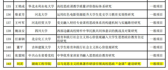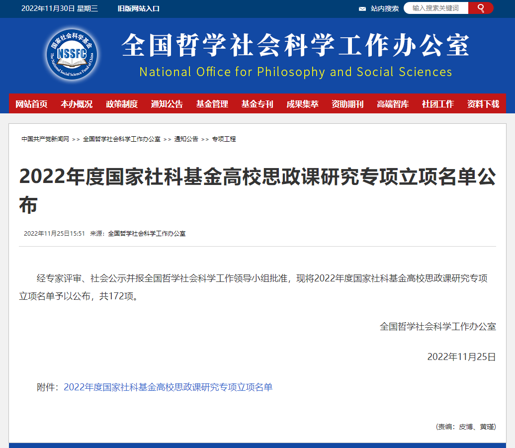 全国哲学社会科学工作办公室设立的国家社会科学基金高校思想政治理论课研究专项,旨在贯彻落实习近平总书记在学校思想政治理论课教师座谈会上的重要讲话精神,落实立德树人根本任务,深入研究思想政治理论课基本规律和重大问题,推动思想政治理论课改革创新。2022年度该专项共批准172项,湖南仅6所高校获批,我校是唯一获批的工科类院校。