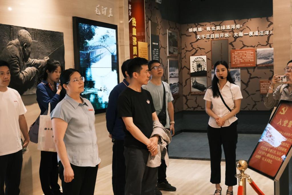 徒步抵达韶山银河渡槽后,党员们走进韶灌陈列馆。在讲解员的带领下,大家驻足于泛黄的工程图纸、生锈的劳动工具、珍贵的历史影像前,聆听“七天七夜抢修北干渠”“妇女突击队凿岩开渠”等感人故事。陈列馆内,一幅巨型浮雕震撼呈现十万建设者“白天红旗招展、夜晚灯笼火把”的会战场景,搭配实景还原的“工地食堂”“简易工棚”,让党员们穿越时空,真切体会到先辈们“一不怕苦、二不怕死”的拼搏精神。