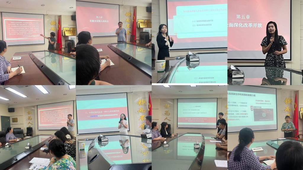 教研室全体教师及部分兼课教师根据各专题内容展开教学展示。其中张文武讲授《邓小平理论首要的基本的理论问题和精髓》;钟立华讲授《维护和塑造国家安全》;闵雪讲授《毛泽东思想的主要内容和活的灵魂》;蒋卓娅讲授《为什么要全面深化改革开放》;马超群讲授《坚定中国特色社会主义政治制度自信》,李沙沙讲授《坚持走中国特色社会主义法治道路》;汪益民讲授《新时代坚持和发展中国特色社会主义》;高梦薇讲授《文化是民族生存和发展的重要力量》。