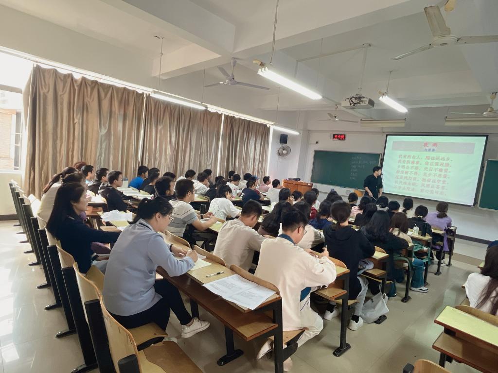 公开课由大学语文教研室主任唐林轩主讲,他以《中晚唐诗》为题进行教学展示。唐老师围绕白居易、刘禹锡、元稹、李商隐、杜牧等中晚唐诗人,讲授其诗歌作品、人生经历、作品分类及其特色,授课深入浅出,条理清晰,重难点突出。唐老师精选典型作品,通过陶冶情操的篇章、优美的文字、打动人心的情感来拨动学生的心弦,提升学生的审美能力和道德品质。同时唐老师所呈现的作品丰富多元,在教学过程中播放当代歌手倾情演唱的诗歌作品,鼓励学生吟唱古代诗歌,将诗歌灵动鲜活地展现出来,也让学生受到很好的音乐熏陶。