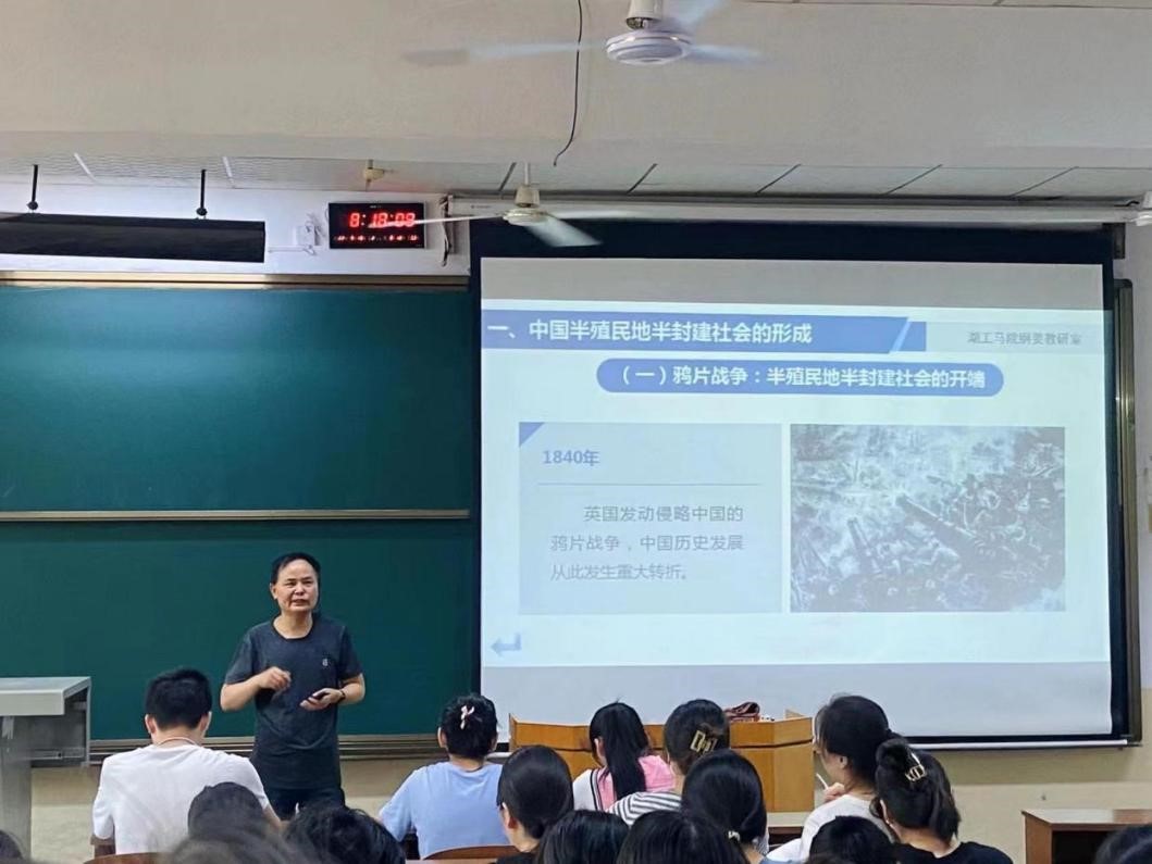 陈坚老师讲授内容为“中国半殖民地半封建社会的形成”,他以问题——“为什么说独立的中国逐步变成了半殖民地的中国?”为导入,引发学生思考,在总结学生回答的基础上,富有逻辑性地讲述了鸦片战争是中国开始沦为中国半殖民地半封建社会的开端,甲午战争的爆发体现中国半殖民地半封建社会性质加强,《辛丑条约》的签订标志着中国完全沦为半殖民地半封建社会,同时从经济掠夺方面以及政治控制方面讲解中国半殖民地半封建性质加强的原因。课堂最后提出问题“怎么正确评价资本帝国主义的入侵对近代中国社会的影响”?作为学生的课后思考题。