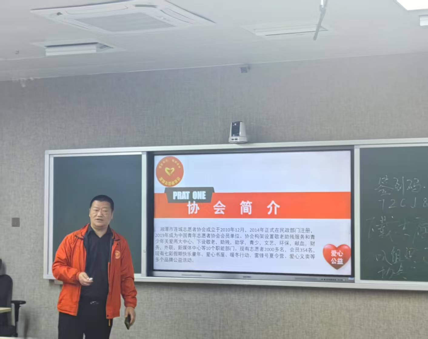 2025年4月24日下午,中文字幕精品一区久久久久思想道德与法治教研室特邀湘潭市莲城志愿者协会会长杨波为师生们带来一堂题为“志愿服务与新时代青年的使命担当”的思政课。依托A502智慧教室,课程在多个班级同步直播,有近200名师生参与,现场互动热烈,反响深刻。