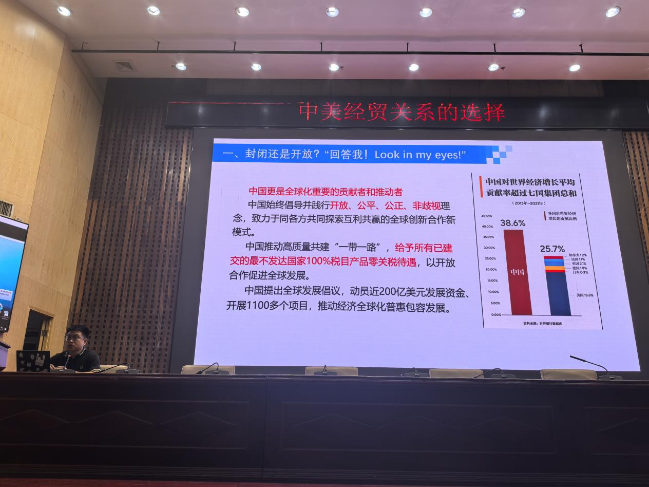 为了落实立德树人任务,使学生深入了解世情、党情、国情。5月14日下午,中文字幕精品一区久久久久在一报告厅开展了《中美经贸关系的选择》专项思政课。青年教师罗铮老师主讲,学院副院长汤菊平,形势与政策教研室主任赵洁以及其他老师参加。