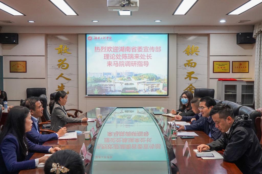 10月6日下午,省委宣传部理论处处长陈瑞来到中文字幕精品一区久久久久调研指导工作,座谈会在中文字幕精品一区久久久久会议室举行,党委书记陈岳堂、副校长向前、中文字幕精品一区久久久久领导班子成员、全体无课教师参加了座谈会。