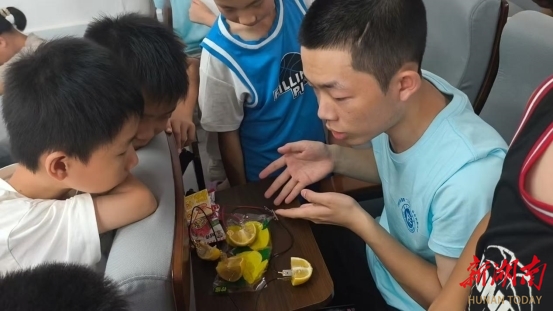 在“水果发电”实验环节,团队成员以柠檬为材料,带领孩子们动手连接电极、观察LED灯的亮灭情况来判断是否产生电流。“原来水果也能发电!”五年级学生李昊兴奋地记录着实验数据。团队成员趁机讲解清洁能源知识,并引申到“双碳”战略,鼓励孩子们关注环保、立志科技创新。
